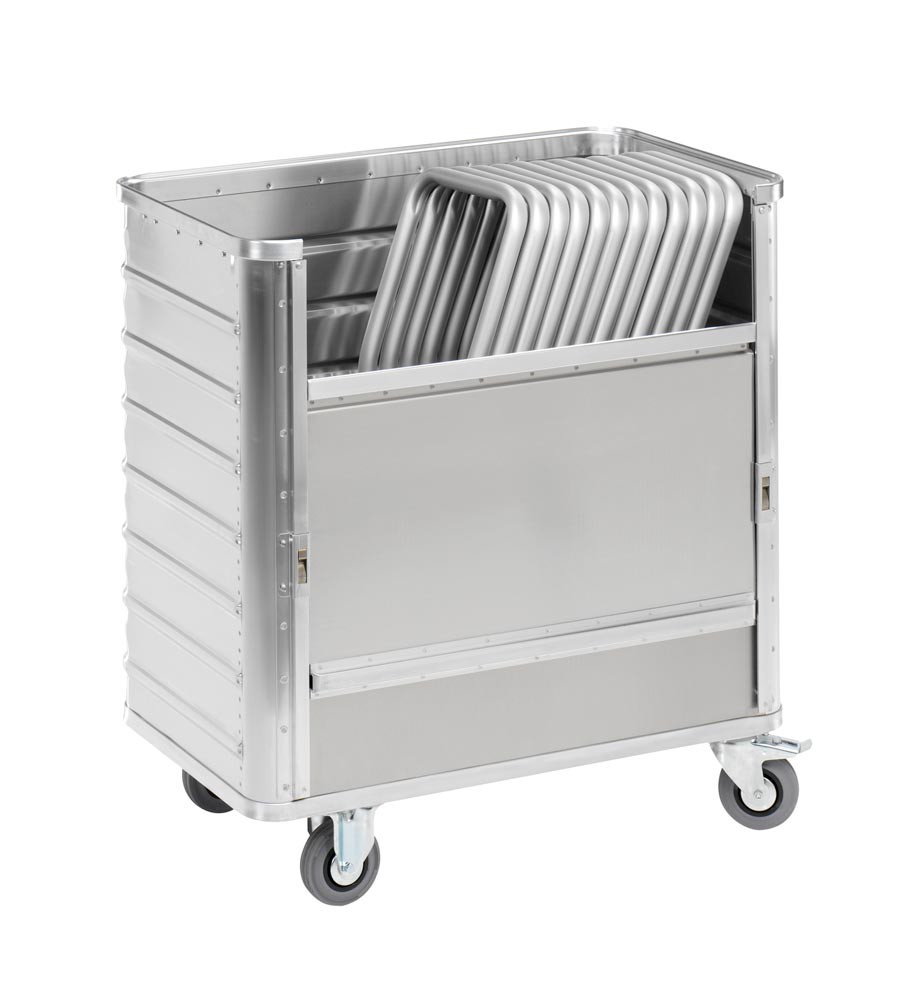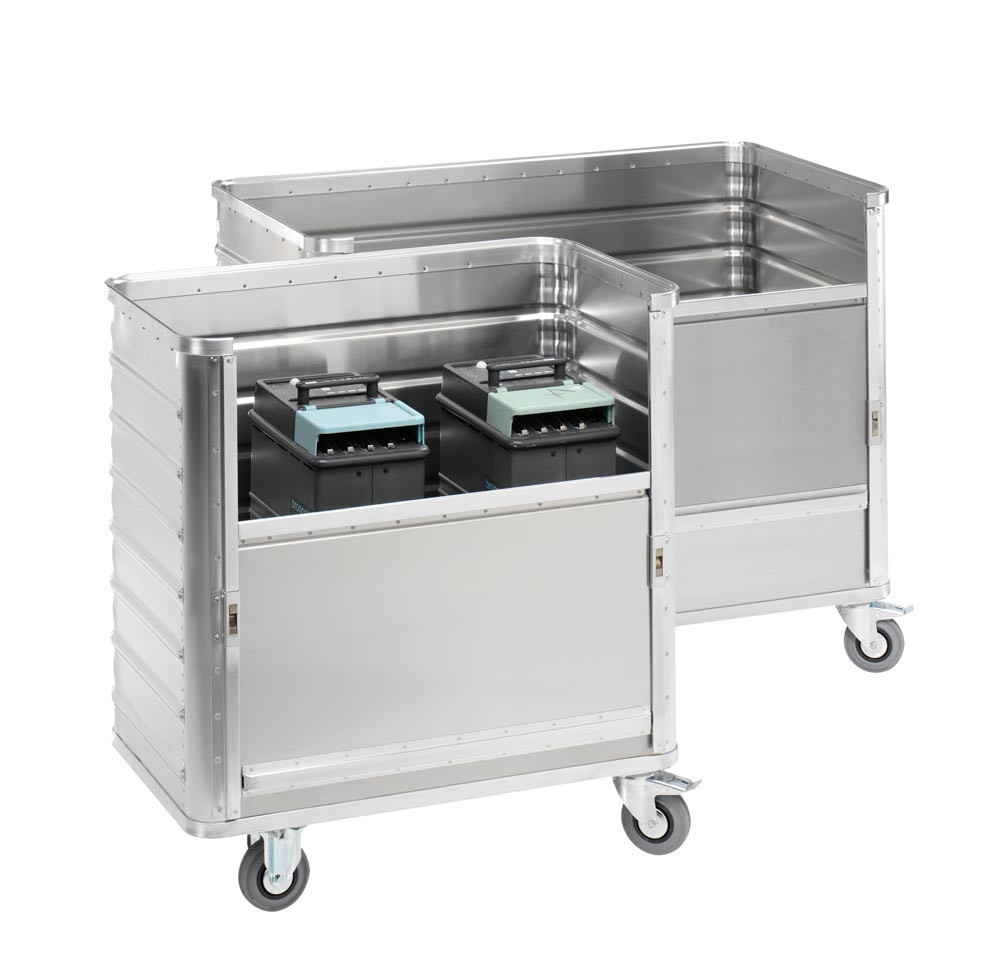 ∙ Aus Aluminium gefertigt und mit trapezförmig ausgeprägten Sicken verstärkt ∙ Umlaufende, sehr stabile Randprofile zur Verstärkung der Wände ∙ Äußerst robust und formstabil ∙ Antistatisch und schmutzabweisend ∙ 2 Lenk- und 2 Bockrollen ∙ Lenkrollen gemäß EN 1757-3 mit Rad-Feststeller