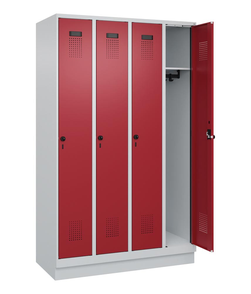 Garderobenschrank, Sockel, 4 Abteile, Abt.B 300 mm, Drehriegel, BxTxH 1200x500x1950 mm, Farbwahl
