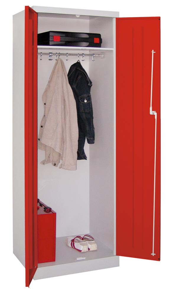 Garderobenschrank mit Sockel, 1 fester Fachboden, 1 Stange mit 10 Haken, BxTxH 600x500x1800 mm, RAL 3000 E1571065