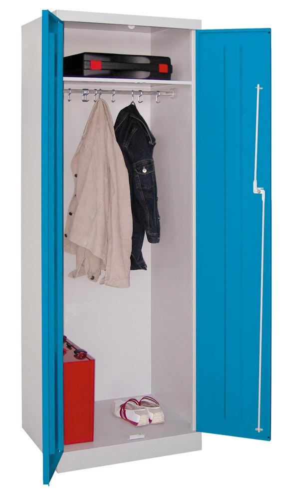 Garderobenschrank mit Sockel, 1 fester Fachboden, 1 Stange mit 10 Haken, BxTxH 600x500x1800 mm, RAL 7035/5015
