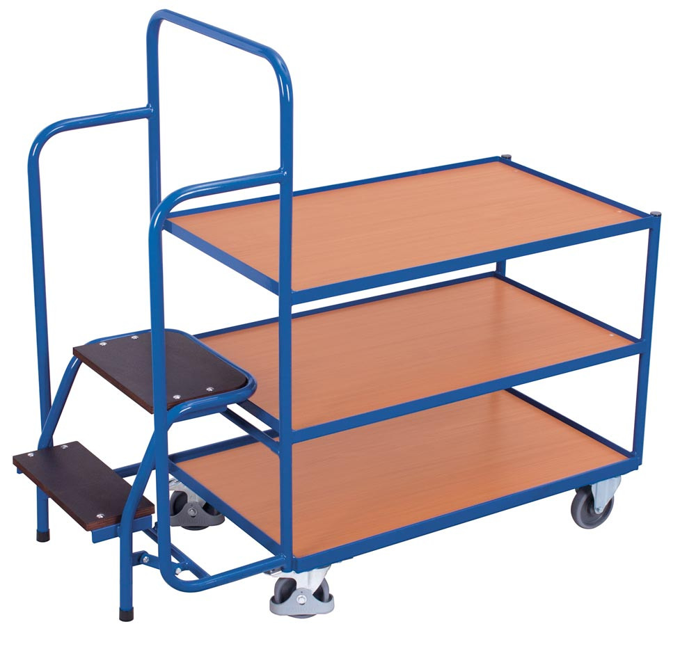 Kommissionierwagen, 3 Ladeflächen LxB 985x590 mm, Leiter 2-stufig, Außenmaße LxBxH 1455x625x1320mm, Traglast 250 kg