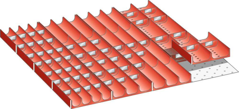 Mulden, Fronthöhe 50 mm, 4x4-tlg. + 8x3-tlg. + 4x2-tlg.. Muldenwände 30x4-tlg. + 20x3-tlg. + 10x2-tlg., Schublade nnutzgröße BxT 612x612 mm