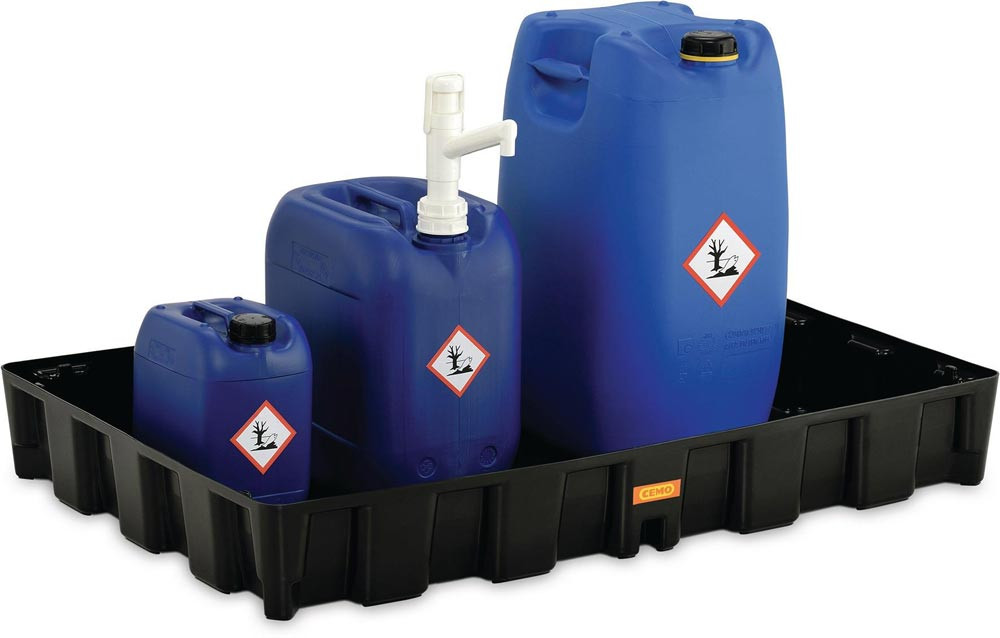 für Kleingebinde · zur sicheren und vorschriftsmäßigen Lagerung gewässergefährdenden Flüssigkeiten der GHS-Kategorien 1-4 · aus HD-Polyethylen · sehr beständig gegen Laugen, Öle und Säuren · stapelbar · konzipiert für Kombination auf Europalette