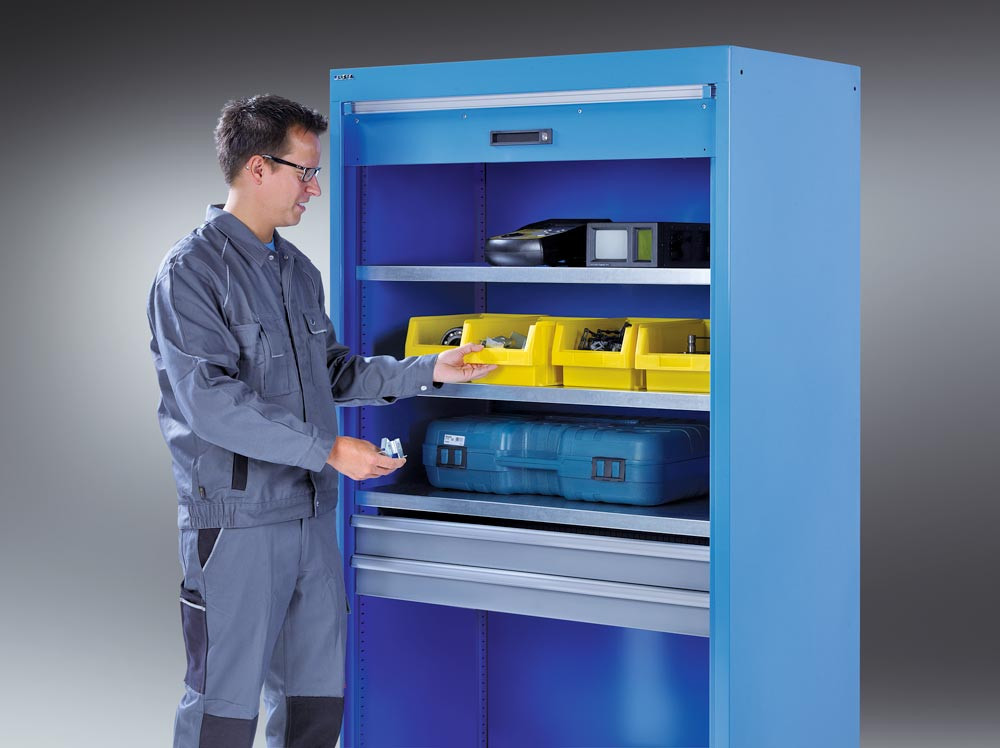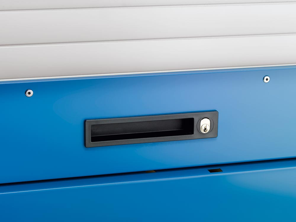 ∙ Bieten bei engen Raumverhältnissen vollen Zugriff auf das gesamte Lagergut ∙ Stabile Schließleiste aus Metall mit Klemmschutz ∙ Auswechselbarer Zylinder ∙ Inneneinrichtung im 25 mm Raster ∙ Max. Traglast: Gehäuse 500 kg ∙ Verstellböden 30 mm stark ∙ Auszugböden, Schubladen: lackiert, Farbe: RAL 7016 anthrazitgrau ∙ Rolllade: PVC, Farbe: ähnl. RAL 7035 lichtgrau ∙ Strapazierfähige Pulverlackierung