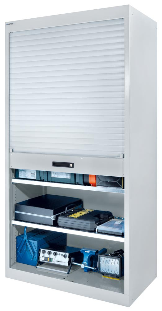 Rollladenschrank, BxTxH 1000x580x1950 mm, 2 Verstellböden, 3 Auszugböden, 2 Schubladen, RAL 5012, Rolllade grau