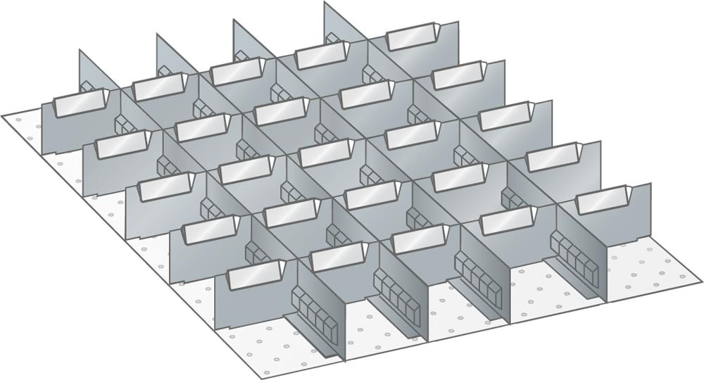 Trennwände, Fronthöhe 75 mm, 4 Schlitzwände 36E, 15 Trennbleche 5E, 10 Trennbleche 6E, Schubladennutzgröße BxT 459x612 mm